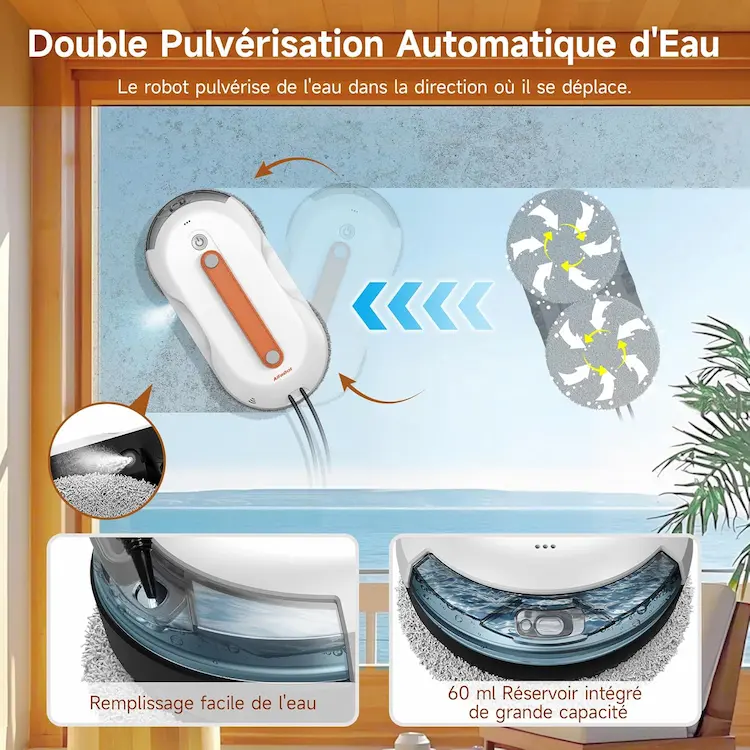 Contrairement à l’AlfaBot X6 qui nécessite d’humidifier les lingettes microfibres manuellement, l’AlfaBot X7 gère l’humidité de façon autonome. C’est le secret pour éviter les traces de « passage à sec » qui surviennent souvent en fin de cycle sur les modèles inférieurs. La brume ultrasonique pulvérisée est si fine qu’elle ne coule pas, évitant ainsi les coulures sur vos cadres de fenêtres.