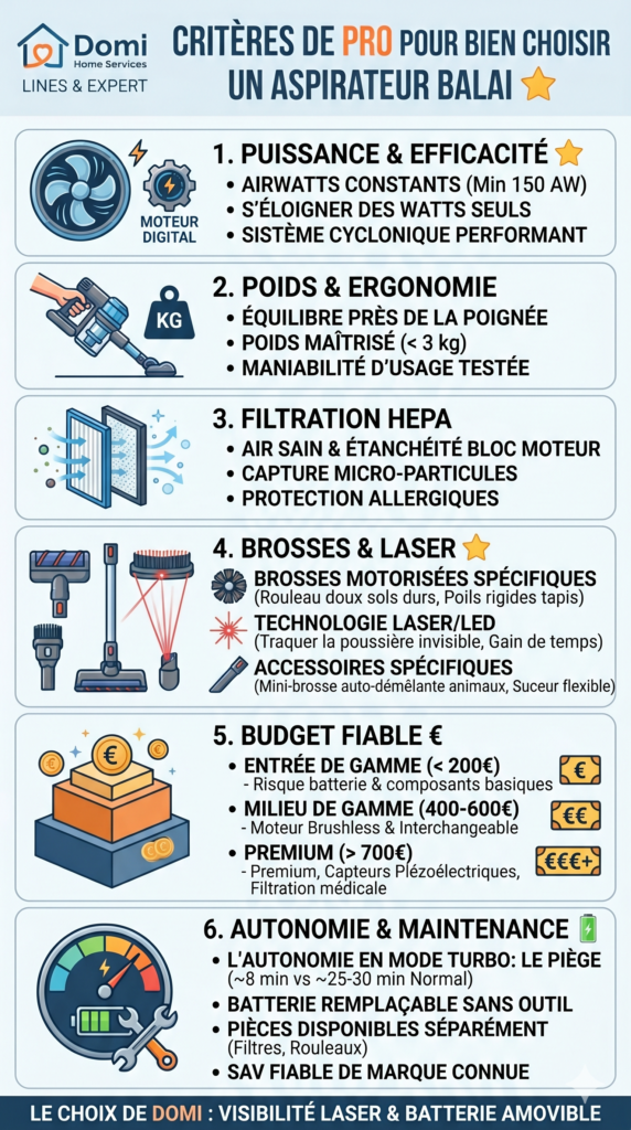 Pour choisir un aspirateur balai en 2026, privilégiez l’équilibre et la qualité de filtration. Un modèle avec éclairage laser et brosse spécialisée pour sols durs transformera votre routine ménage. Ne négligez pas le SAV : un appareil réparable est toujours plus rentable qu’un modèle jetable à bas prix. Mon choix se porte systématiquement sur des modèles offrant des batteries amovibles pour garantir la pérennité de votre investissement.