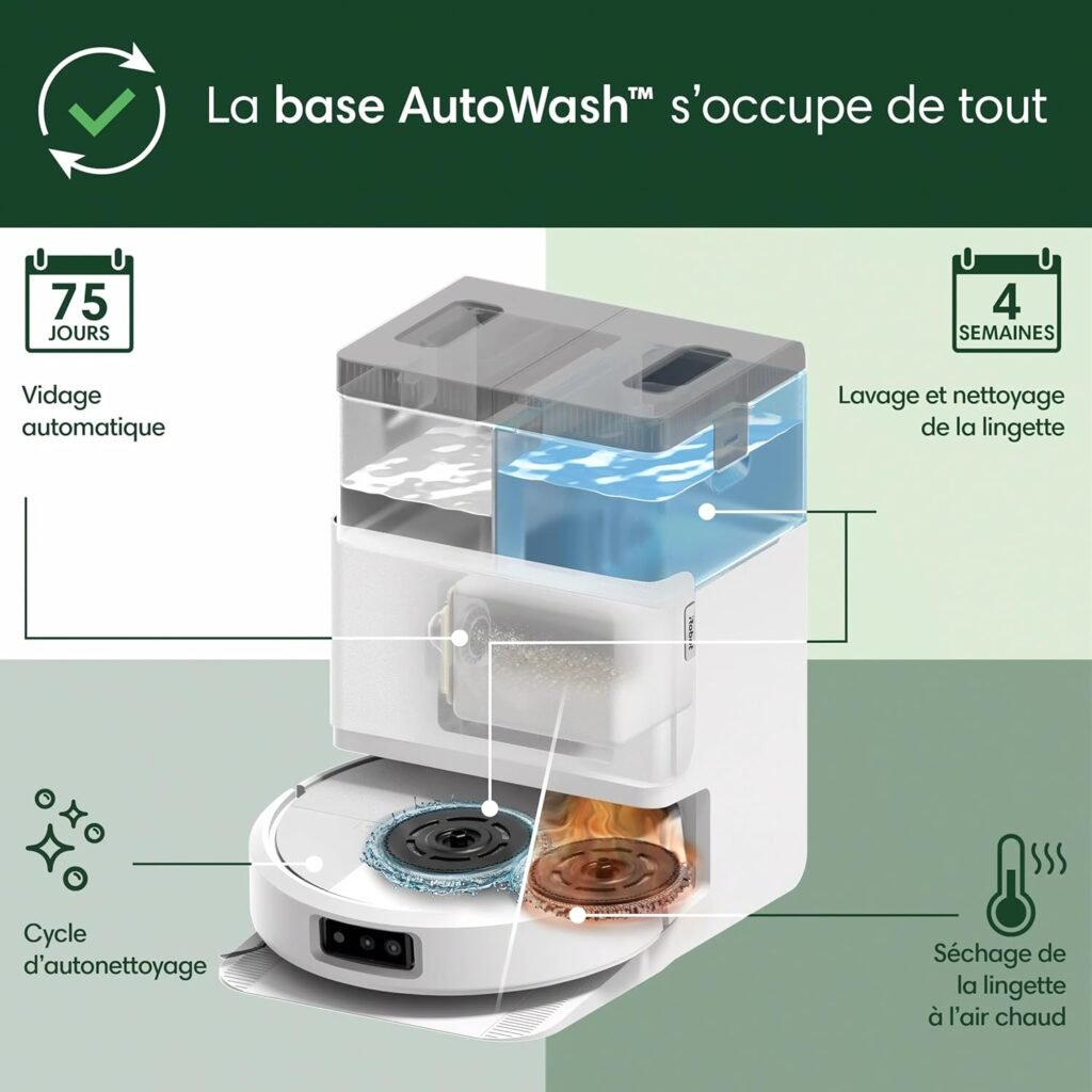 Autonomie totale (Lavage & Séchage) : La station ne se contente pas de vider la poussière, elle lave et sèche également la serpillière à l’eau chaude après chaque passage pour éviter les mauvaises odeurs.